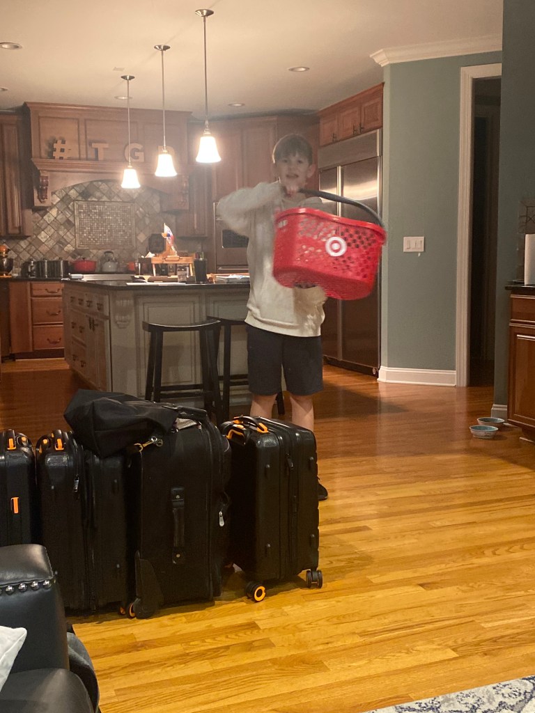 3:20 pm: Our “divide and conquer” tactic is in full play as we seek out our luggage. Roman has his bucket hat on hiding his blonde hair and blue eyes and is pulling luggage off the conveyer like a pro.