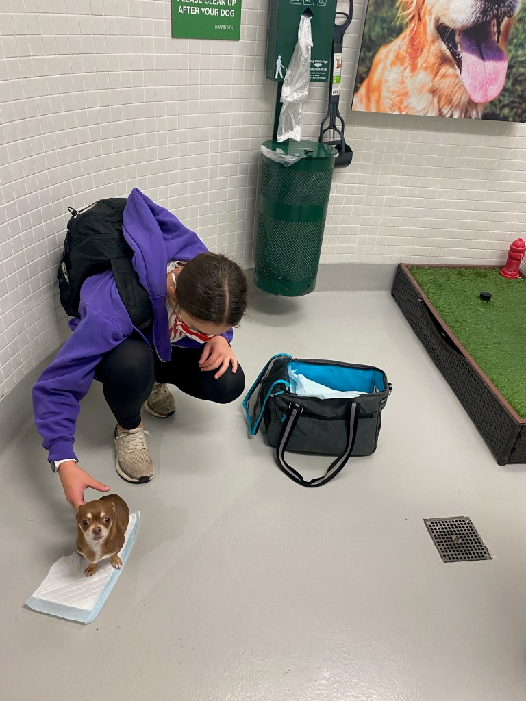 9:20 am: Banjo turns his nose up to the emotional support pet rest stop. He is as snotty as a dog can get. He does not relieve himself. He is absolutely nervous and hates this place. Gi starts screaming because there is a flying roach. We are all terrified.